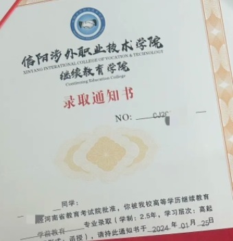 七、信阳涉外职业技术学院成人高考录取通知书