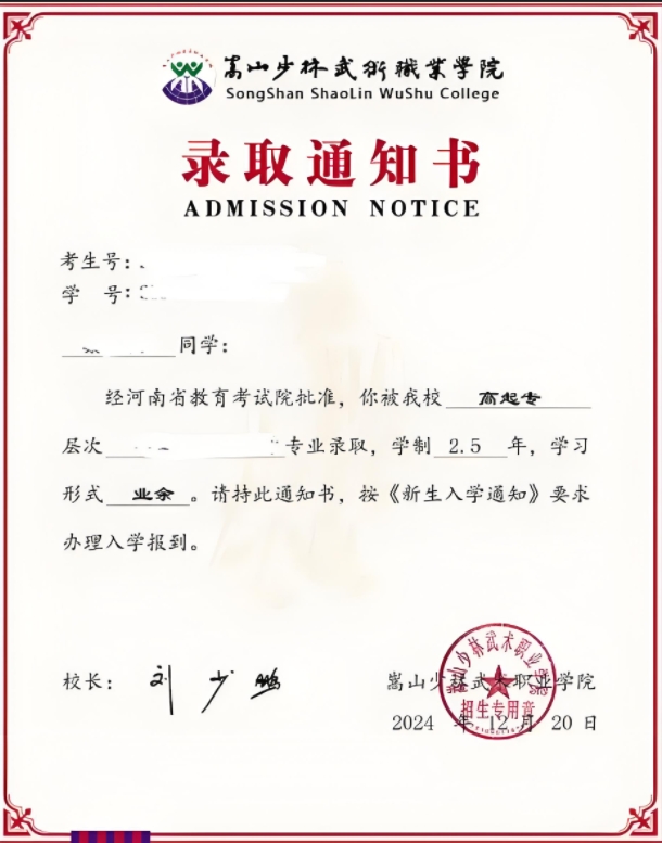 七、2025嵩山少林武术职业学院成人高考录取通知书(参考2024年)